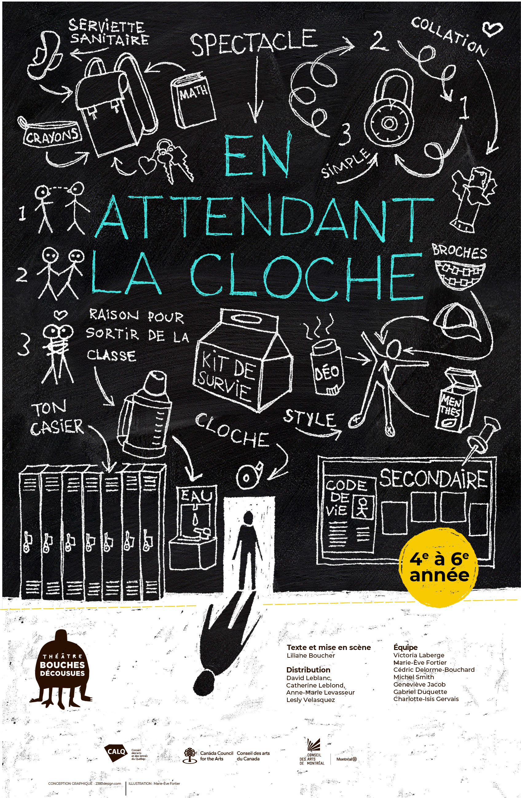 En s’alliant avec le public, cette équipe improbable navigue à travers des enjeux qui dépassent le fait de savoir déverrouiller son cadenas et de trouver son chemin dans les corridors. Quand on s’aventure dans ce passage encore mal éclairé vers l’avenir, des questionnements irrépressibles émergent sur le besoin d’appartenir et d’être aimé. Le théâtre, la vie, le secondaire… parfois absurdes, souvent déroutants et merveilleusement chaotiques.
